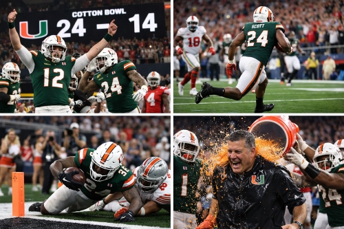 Miami pulled off a stunning 24–14 upset over defending national champion Ohio State in the Cotton Bowl, earning a spot in the College Football Playoff semifinals.